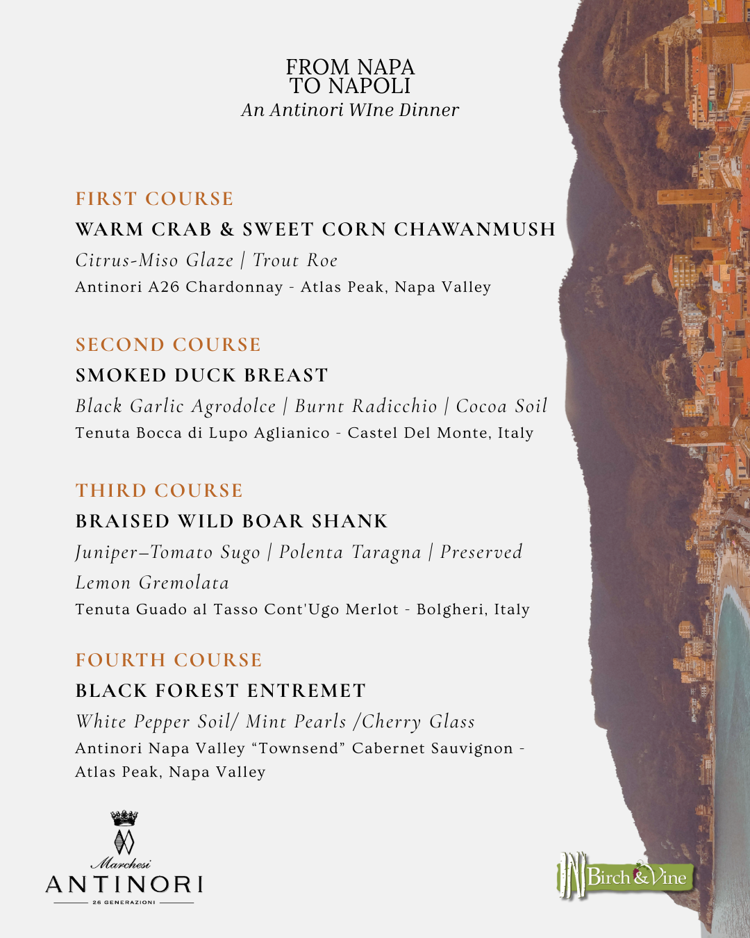 Six centuries of Antinori heritage come together in a thoughtfully curated four course culinary pairing, highlighting celebrated wines from Tuscany, Bolgheri, and Napa Valley.