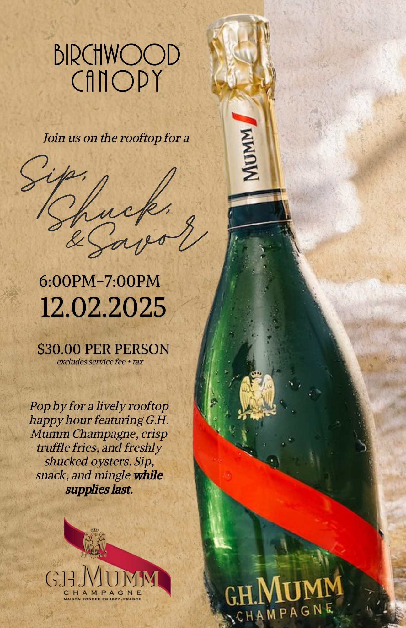 Join us for a lively rooftop evening filled with flavor and fizz. Sip on GH Mumm Champagne as you savor freshly shucked oysters and crispy truffle fries, all served reception-style while supplies last. Whether you’re catching up with friends or winding down after work, this 21+ event is the perfect excuse to toast to good company and great taste.