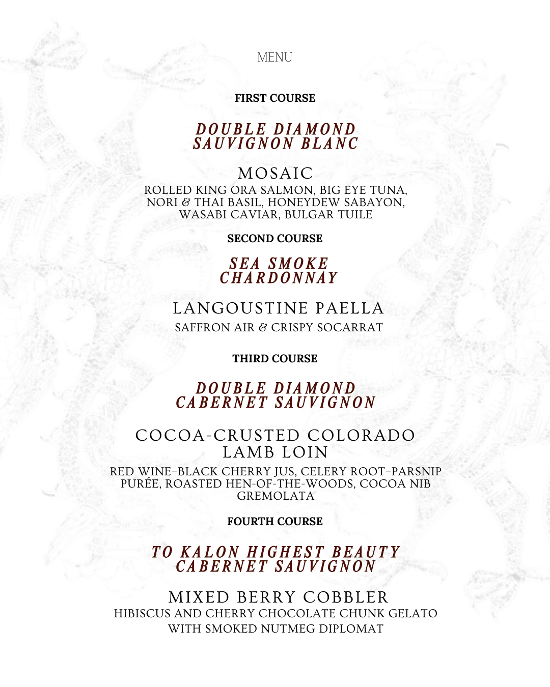 Each course is carefully designed to complement the depth and structure of these celebrated Cabernet Sauvignon selections, creating a seamless progression of food and wine that is both elegant and expressive. 🍽️🍇