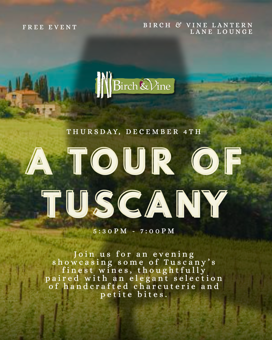 Join us for a complimentary evening celebrating the flavors of Tuscany. Enjoy a curated selection of chef-crafted charcuterie and petite bites, perfectly paired with some of Tuscany’s finest wines.