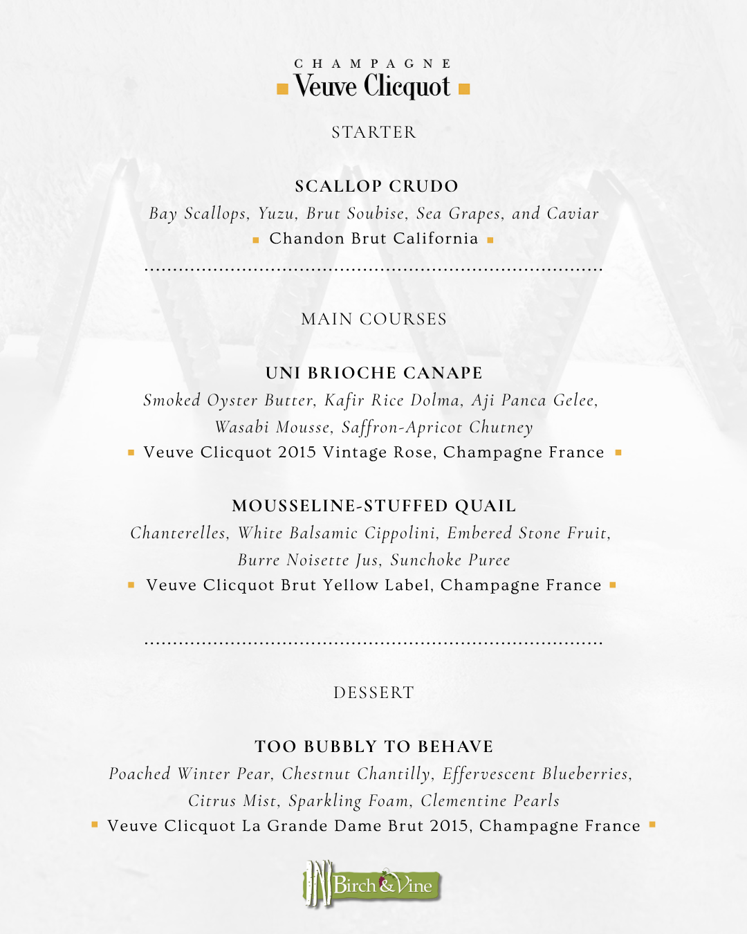 Each course has been crafted to complement the rich character and vibrant effervescence of Veuve Clicquot, creating a harmony of flavor and finesse.