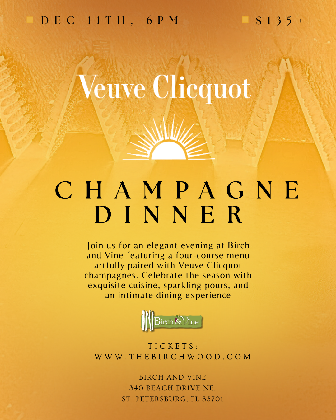 Join us on Thursday, December 11th at 6 PM for an evening of refined taste and sparkling elegance at Birch & Vine. This exclusive Veuve Clicquot Champagne Dinner will feature a four-course culinary journey expertly paired with the world-renowned cuvées of Veuve Clicquot.