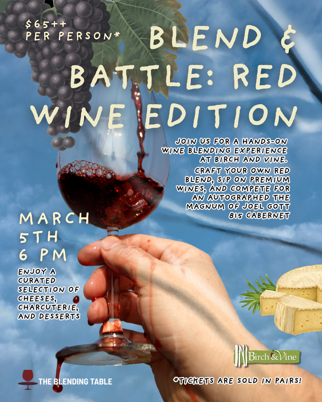 Join us for a Wine Blending Workshop at Birch and Vine, led by our in house Sommelier and a special guest sommelier host. This hands on experience walks you through tasting, blending, and evaluating red wines selected to highlight the style and structure of a featured region. No experience needed, just a love for wine.